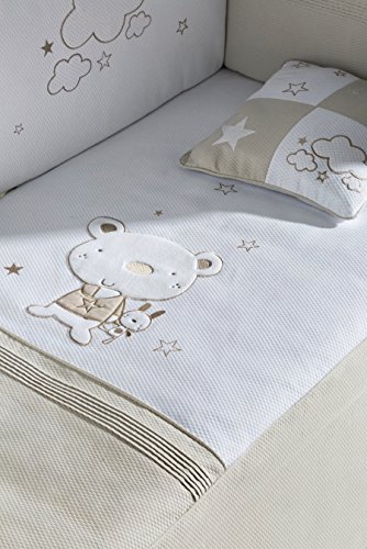 Las medidas que más trabaja la marca son para cuna de bebé y suelen tener motivos de animales como conejos, elefantes, tucanes; motivos de estrellas sobre fondo blanco.